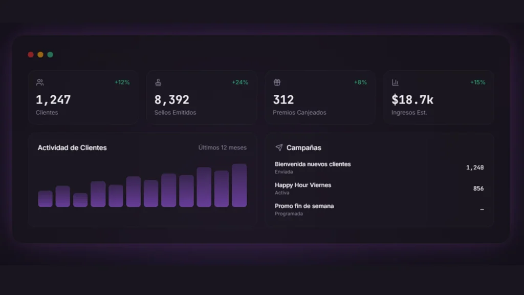 Visualiza clientes activos, sellos, canjes y rendimiento desde tu dashboard.